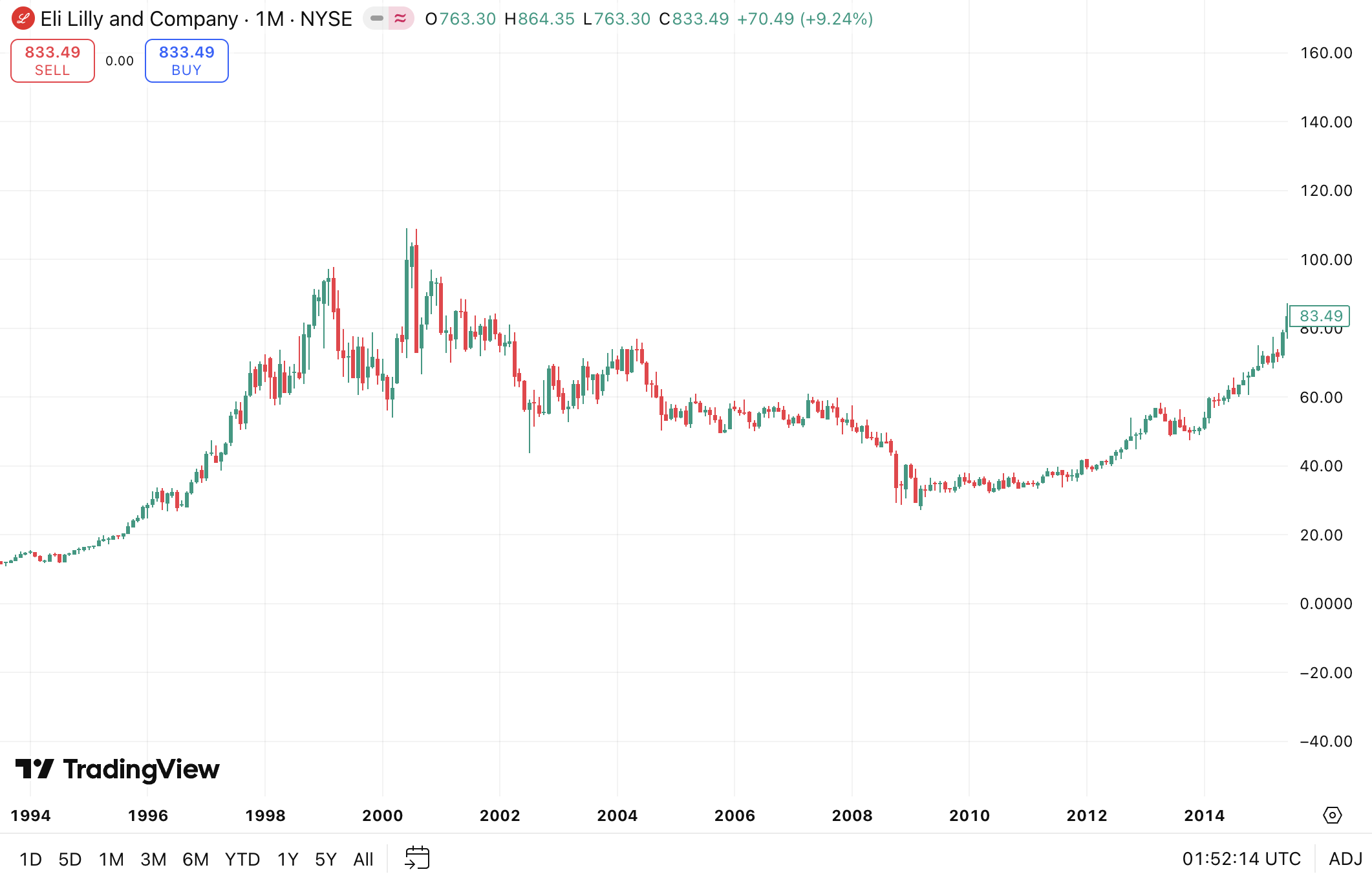Back then, LLY was best known for Prozac, the world’s leading antidepressant, along with a solid diabetes business and a promising pipeline. It wasn’t a speculative biotech it was a well-run blue chip but its future still depended on developing new blockbusters to replace aging patents.